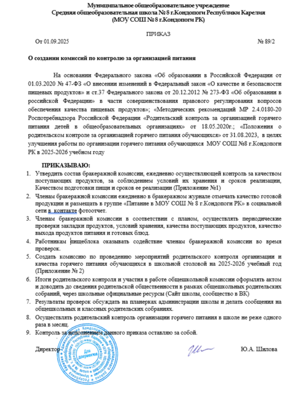 Порядок проведения мероприятий по родительскому контролю за организацией питания обучающихся, в том числе регламентирующего порядок доступа законных представителей обучающихся в помещения для приема пищи, регламентируется локальным нормативным актом общеобразовательной организации.